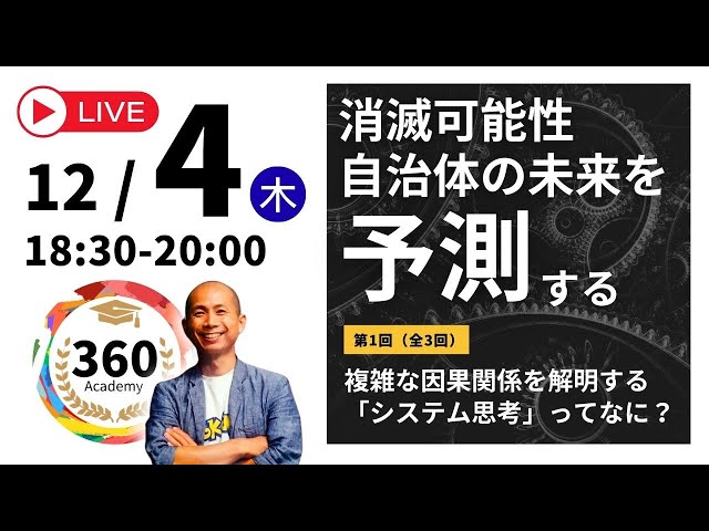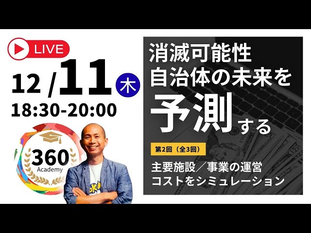 私たちの町は破綻してしまうの? 町の実態を正しく知るにはどうすればいいの? 最新のデジタル技術を駆使して未来を予測する計算機をつくってみましょう。 自治体の財政は複雑で、公表されている情報を見てもイマイチ全容が分かりません。 自分の住んでいる町の財政が本当に大丈夫なのか? そもそも「大丈夫」って何を基準に決まるのか? 今目の前で進んでいる政策や事業は、本当に未来にとって必要なのか? 考えればきりがない町の今と未来の事。 そんな複雑な予測をするために役立つのが「システム思考」という考え方です。 講師:椙原俊典(すぎはらとしみち)/360 Academy 代表